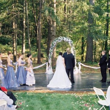 An outdoor wedding venue in a forest of Ponderosa Pines, Cedar, and Fir trees with a canopy of spreading branches aglow with bistro lights at night will add rustic beauty to your celebration at our outdoor wedding venue.